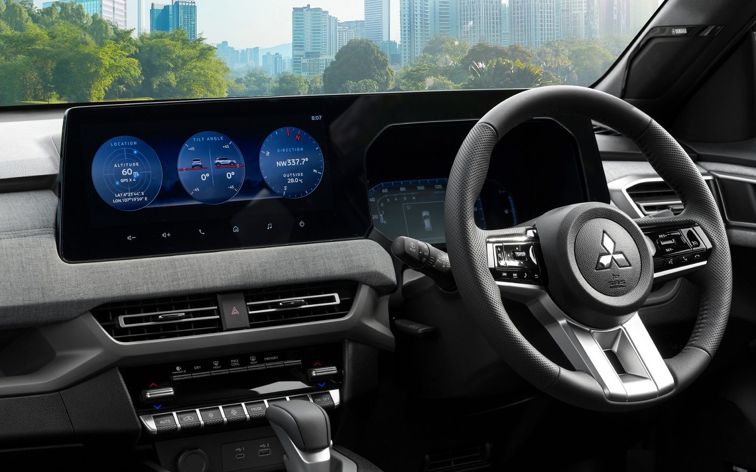Về hệ thống giải trí, Mitsubishi Xforce sở hữu nhiều tiện nghi ấn tượng. Tại khu vực trung tâm là màn hình kỹ thuật số kích thước 12,3 inch được nối liền mạch với cụm đồng hồ. Hệ thống âm thanh sử dụng loa cao cấp Dynamic Sound Yamaha Premium cho phép điều chỉnh âm lượng và chất lượng âm thanh dựa theo tốc độ và mặt đường xe di chuyển.